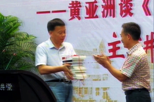 在讲座开始前,学校举行了图书授受仪式,黄亚洲老师将其编写的部分小说和诗集赠送给我校图书馆,校党委副书记唐和祥代表我校接受赠书。