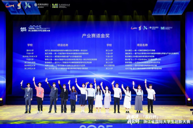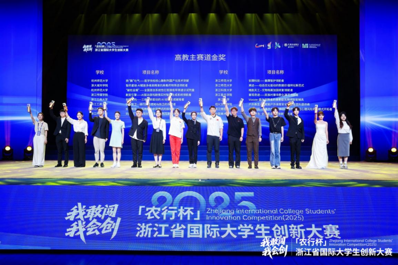 7月11-13日,“农行杯”浙江省国际大学生创新大赛(2025)决赛在浙江机电职业技术大学圆满落幕。本届大赛以“我敢闯,我会创”为主题,吸引了全省100多所高校、5.9万个项目、43.9万青年学子积极参赛。省教育厅总督学陈仁坚,省农行党委委员、副行长胡隽等出席闭幕式并为获奖团队颁奖。