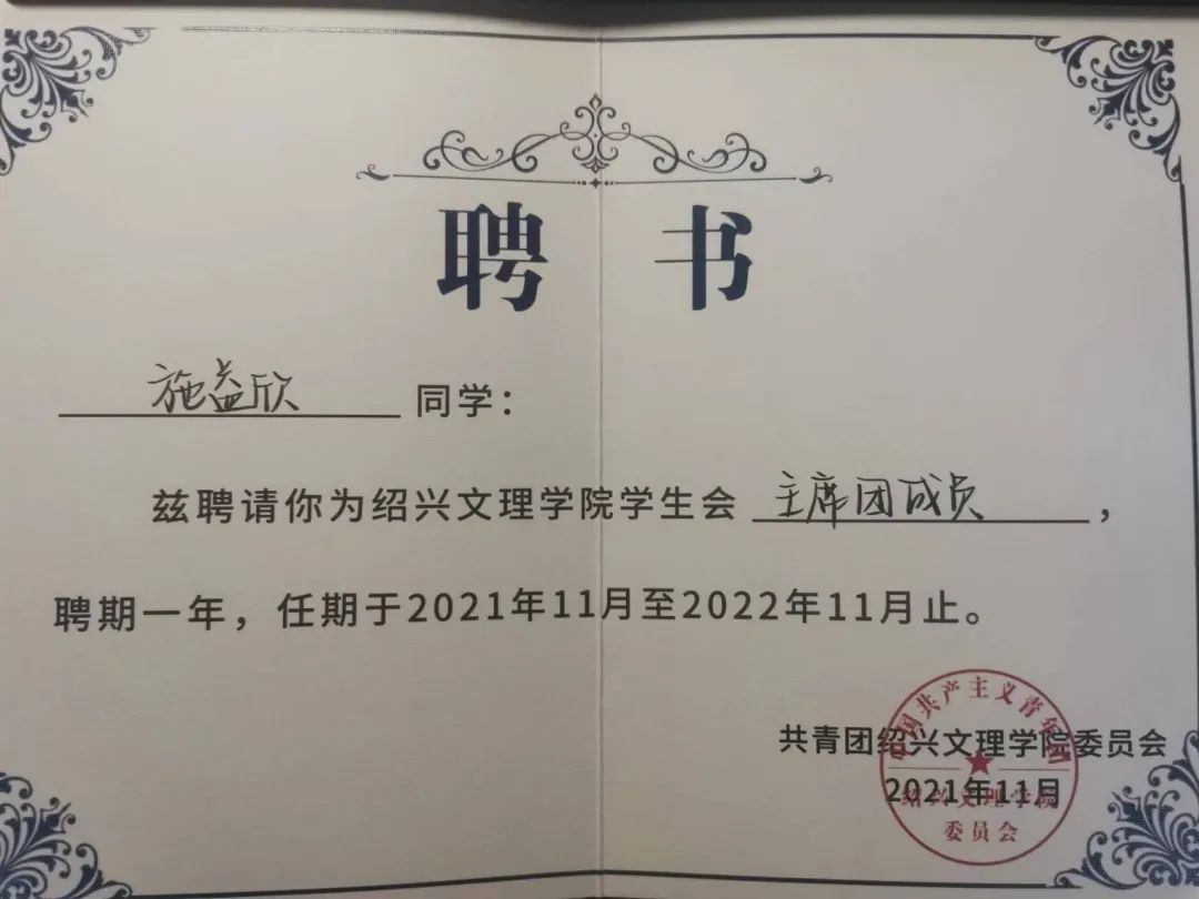 在工作的锻炼与磨砺下,他学会了如何从容有条理地表达自己的想法。无论是在学院的学生组织里任职的日日夜夜,还是在班级里为同学服务的晨光夕阳,都能看到他的身影。在这过程中他也收获了最真挚的友谊与感动。作为学长,他经常帮着学弟学妹们解决学习、生活中遇到的问题,展现了文理学子乐于助人、团结友爱的精神风貌。在同学谢超颖眼中,施益欣是一位积极进取、有责任有担当的学长。