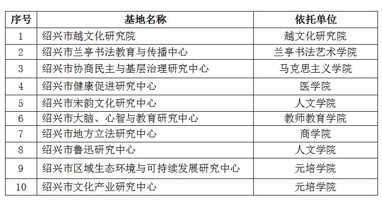 9月27日,绍兴市社会科学界联合会发文公布新一轮绍兴市哲学社会科学重点研究基地名单,全市共确立27家研究机构为新一轮绍兴市哲学社会科学重点研究基地,其中我校占席10家,占比达37%。具体名单如下: