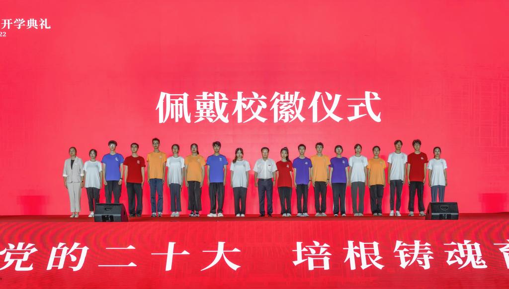 校党委书记汪俊昌为新生代表佩戴校徽。校长赵阳致辞,向新生的到来表示热烈欢迎。校党委副书记张宏主持开学典礼。