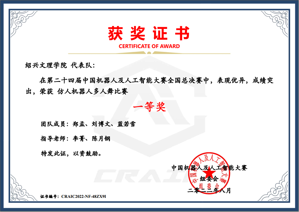 这是我校第三年参加该项赛事,从2020年的全国二等奖1项、全国三等奖1项,到2021年的全国一等奖1项、全国二等奖2项,再到2022年的全国一等奖3项(两个赛项均全国第一名)、全国二等奖2项。取得优异的成绩,标志着我校的机器人及人工智能学科竞赛基地,在仿人机器人舞蹈赛项上已经全国顶尖,具有一流的水准;也标志着我校的人工智能协同创新中心,通过实施多学科交叉融合,有效地将科学研究引入到了本科人才创新能力培养上,既锻炼了学生的动手实践、团队协作、科学探索等能力,也培养了创新与跨学科的意识,又提升了学生的审美情趣、文化修养等综合素质。