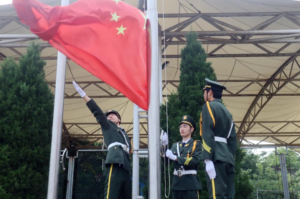 闭营式在庄严的升国旗仪式中拉开序幕,全体师生、教官面向国旗行注目礼。