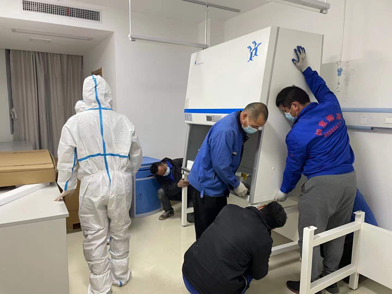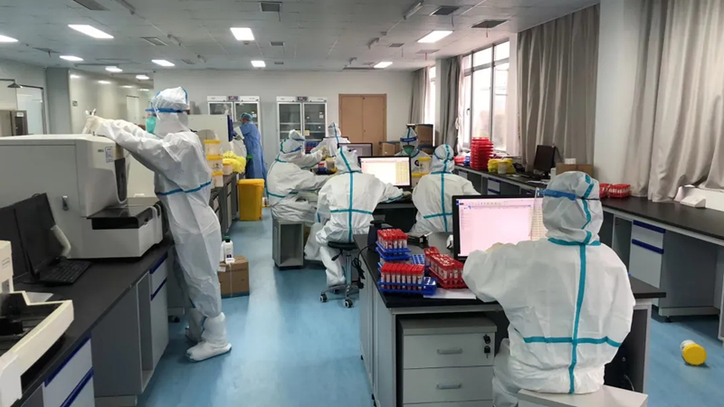 12月7日中午,绍兴城市核酸检测基地启用。面对人员紧、任务重、风险大等问题,基地实验室负责人董学君、检测队长郑专、副队长丁龙和陈江南等主要骨干,一边设法解决问题,一边组织全体队员快速完成检测任务。当天起,来自附属第一医院(绍兴市人民医院)等医疗单位的近90名检测人员临时组成4个检测小组,由周冬、章卓亮、俞泽、石少波任组长,带领全体队员24小时不间断运转。附属第一医院领导寿清和、钱宇现场指挥核酸检测实验室扩建工作,组织各方力量,清空病房、采购物资、现场施工,各项扩建工程紧张有序进行。董学君、钱志宏、朱伟健、王侃等相关科室负责人和省专家郦卫星、宋超一起,从方案设计、施工指导、设备安装,夜以继日,争分夺秒,12月12日中午12点,新扩建的实验室基本完成。
