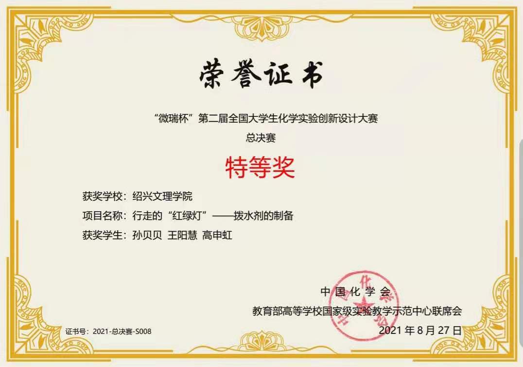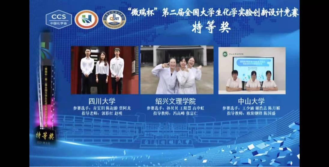该赛事是由中国化学会和教育部高等学校国家级实验教学示范中心联席会主办的全国性大学生学科竞赛,旨在强化大学生发现、分析和解决问题的能力,培养大学生的创新意识、创新精神和创新能力。竞赛在全国分东北、华北、华东、华中、西北、西南、华南共七个分赛区进行初赛,然后进行总决赛。孙贝贝团队在华东赛区初赛140支参赛队伍中脱颖而出,荣获一等奖,取得了总决赛参赛资格。后续又在进入全国总决赛的90支参赛团队中,斩获全国特等奖的佳绩。