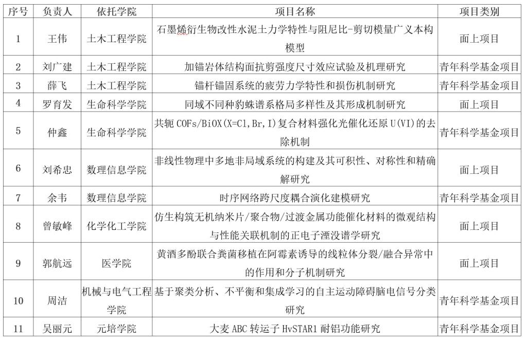 8月18日,2021年度国家自然科学基金集中申报项目评审结果揭晓,我校获批主持11项,其中土木工程学院3项、生命科学学院2项、数理信息学院2项、化学化工学院1项、医学院1项、机械与电气工程学院1项、元培学院1项。具体如下: