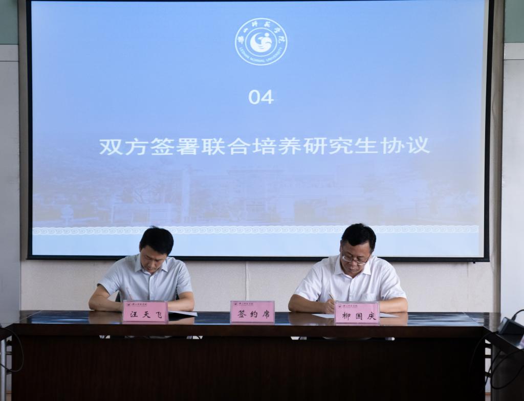 座谈会期间,柳国庆与汪天飞代表两校共同签署了联合培养研究生协议,并举行了学校校外(乐山师范学院)研究生合作指导教师聘任仪式。