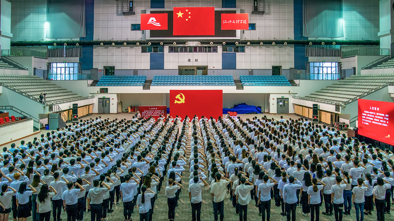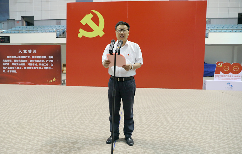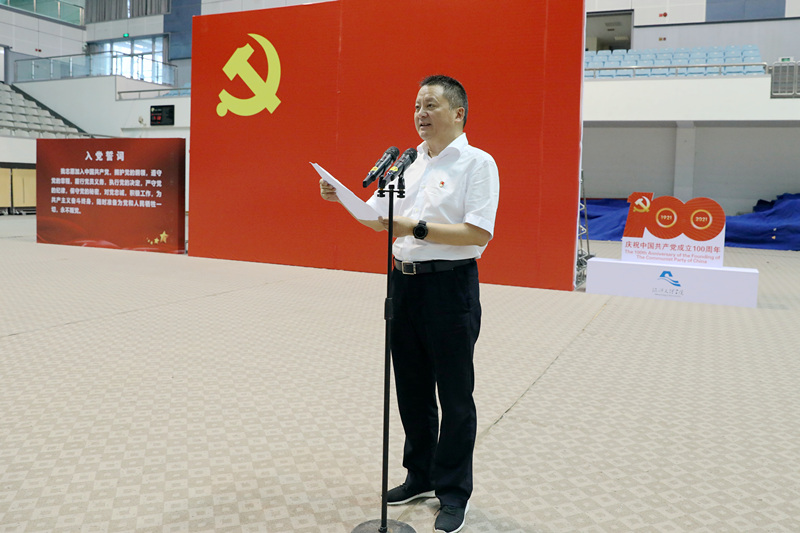 7月1日上午,为庆祝中国共产党成立100周年,激励广大党员坚定理想信念,加强党性修养,教育新党员牢记党的誓言,坚定为党和人民奋斗终身的决心,学校在河西校区体育馆举行2021年新发展党员集体宣誓仪式。校党委书记汪俊昌,校长王建力,校领导班子其他成员,各党群部门负责人,各二级党组织书记、副书记、组织员,新发展党员等参加仪式。仪式由党委副书记沈赤主持。
