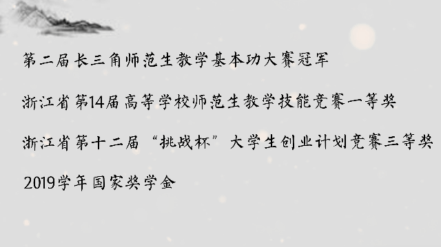 天道酬勤,她想正是因为这日日夜夜、分秒必争的努力,让四年里的她有所收获,连续三年的综合奖学金、浙江省政府奖学金、国家奖学金、浙江省教师技能大赛一等奖、长三角师范生教师技能比赛冠军、两项国家级创新创业项目、浙江省挑战杯三等奖、校十佳大学生等等。