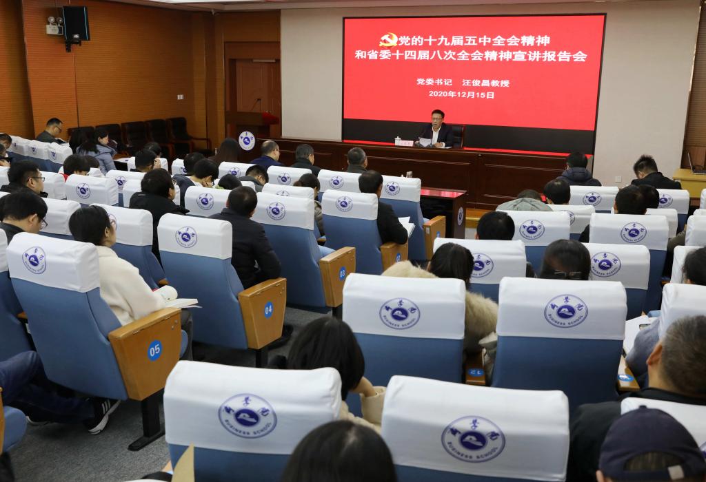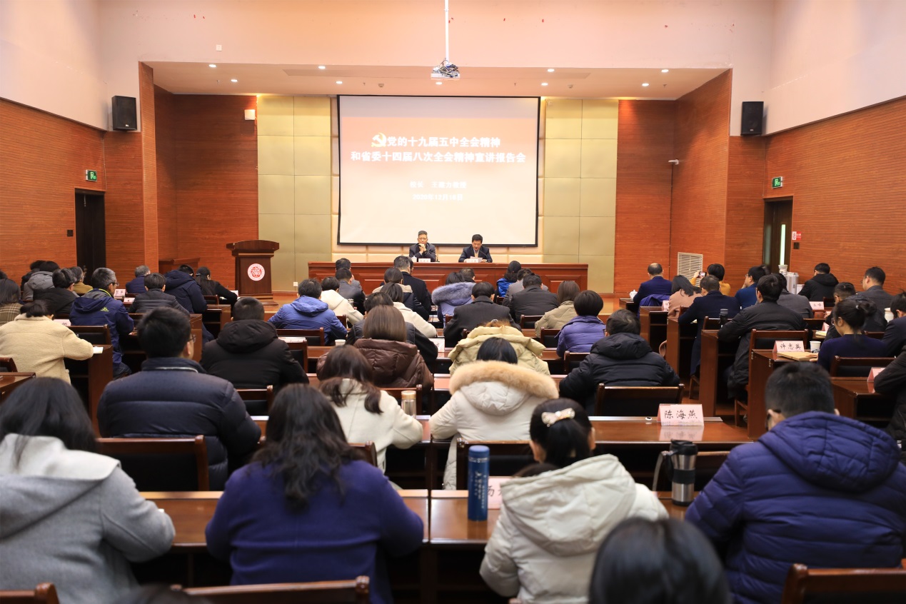 15日下午,校党委书记汪俊昌在南山校区综合楼A405报告厅给本部班作专题辅导报告,宣讲党的十九届五中全会和省委十四届八次全会精神。汪俊昌从新发展成就、新发展阶段、新发展目标、新发展任务、新发展格局、新发展保证等六个方面,对党的十九届五中全会和省委十四届八次全会精神作了深入的解读,并就市委八届九次(扩大)会议落实中央、省委全会精神提出的“率先走出争创社会主义现代化先行省的市域发展之路”作了讲解。16日下午,校长王建力给元培班作专题辅导报告,宣讲党的十九届五中全会和省委十四届八次全会精神。王建力重点围绕《中共中央关于制定国民经济和社会发展第十四个五年规划和二〇三五年远景目标的建议》,结合“十三五”经济社会发展成果、省委、市委“十四五”规划及二〇三五年远景目标,对全会精神进行了全面解读和深入阐释。22日下午,部分因事请假未参加现场轮训的中层干部开展补训,以视频教育的形式集中观看了汪俊昌书记、王建力校长的专题辅导报告。