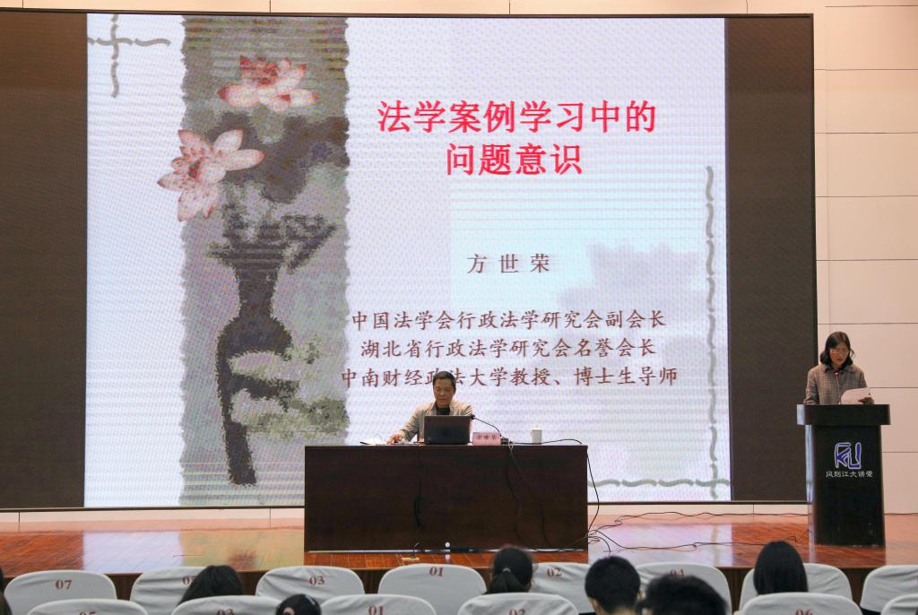 11月13日晚,中国法学会行政法学研究会副会长,湖北省行政法学研究会名誉会长,中南财经政法大学教授、博士生导师,司法部重点学科(宪法与行政法学)学科带头人,中国法学会法治研究基地首席专家方世荣做客“风则江大讲堂”,作题为《法学案例学习中的问题意识》的学术讲座。商学院相关教师和师生代表现场聆听讲座。