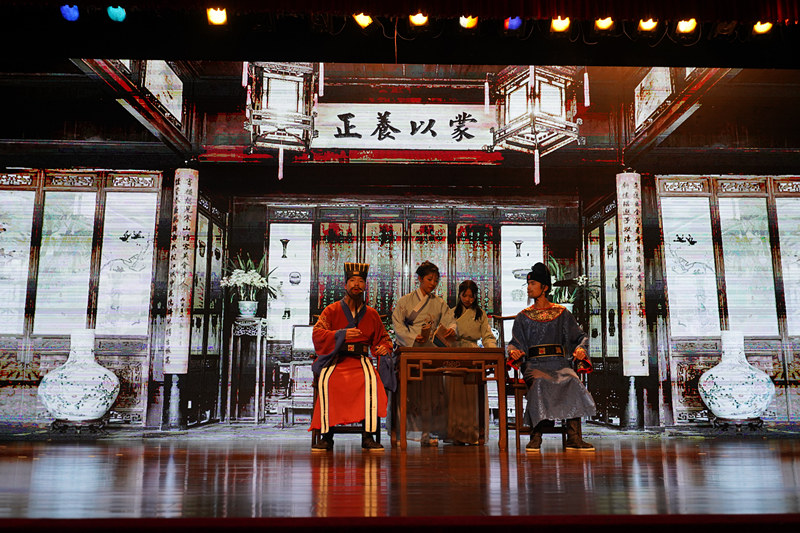 活动期间,与会代表在月明音乐楼集体观看了阳明剧社原创话剧《千古一圣王阳明》和艺术学院编排的“九声四气《咏良知》”表演。话剧演出前,学校举行了“阳明剧社”成立揭牌仪式。
