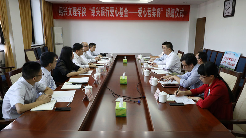 9月24日下午,“绍兴银行爱心基金—爱心营养餐 ”捐赠仪式在行政楼5楼会议室举行。绍兴银行行长金建康、副行长何虹,副校长陈均土,校党委宣传部、党委学工部、后勤管理处、对外联络处、计划财务处相关负责人参加会议。后勤管理处负责人主持会议。