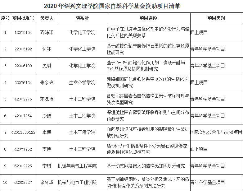 9月18日,2020年度国家自然科学基金集中申报项目评审结果揭晓,我校获批主持9项,其中土木工程学院3项、化学化工学院3项、机械与电气工程学院2项、生命科学学院1项。5月26日,土木工程学院获得了1项国际(地区)合作与交流项目,目前我校共获得2020年度国家自然科学基金项目10项。