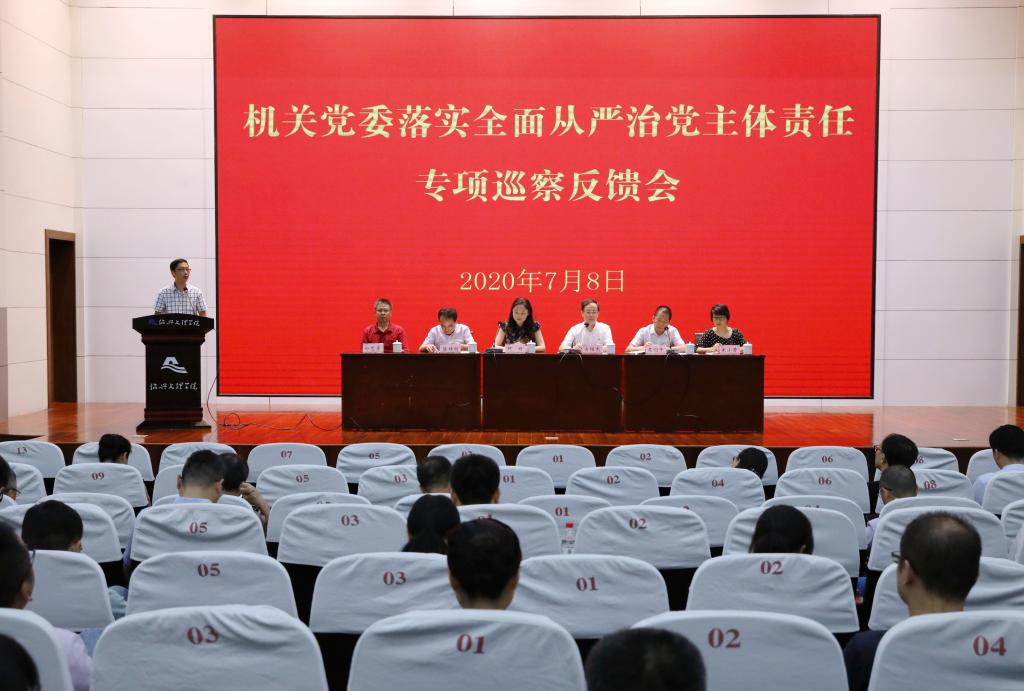 7月8日下午,学校在铁城科教馆一楼报告厅召开机关党委落实全面从严治党主体责任专项巡察意见反馈会。巡察工作领导小组常务副组长、纪委书记柯羽,党委委员、党委组织部部长宣绍龙,党委委员、党委宣传部部长陈均土出席会议,党委巡察办公室工作人员,巡察工作组全体成员,机关党委班子成员、纪委委员、各党支部书记、党委组织员及机关党委所辖各部处主要负责人参加会议。宣绍龙主持会议。