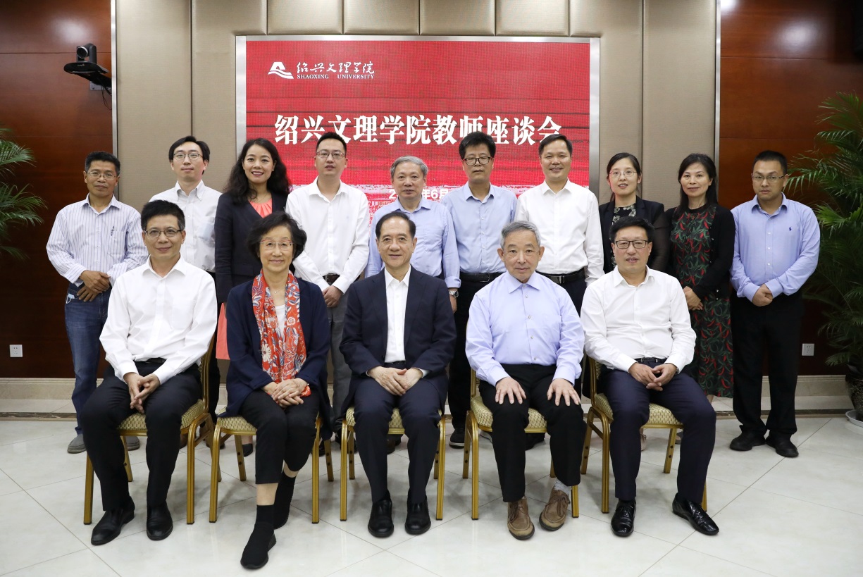 6月9日上午,学校在铁城科教馆一楼会议室召开教师座谈会。“卓越奖学基金”倡设者、十二届全国政协副主席、九三学社中央原主席、中国科协名誉主席、中国科学院院士韩启德,北京大学燕京学堂院长袁明教授,北京大学燕京学堂副院长范士明,第九届浙江省政协副主席冯培恩,九三学社浙江省委员会秘书长过维雅,绍兴市人民政府副市长顾涛出席座谈会。校党委书记汪俊昌,校长王建力,校党委副书记沈赤、郝敬习,副校长柳国庆、张宏,校党委委员宣绍龙、陈均土,以及部分教师代表出席座谈会。座谈会由汪俊昌主持。