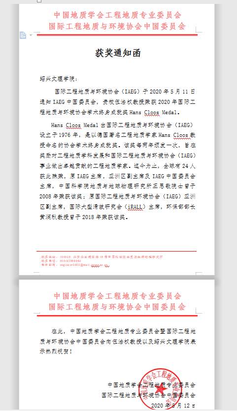 5月12日,中国地质学会工程地质专业委员会和国际工程地质与环境协会中国委员会联合致函学校,通知并祝贺我校伍法权教授荣获2020年国际工程地质与环境协会终身成就奖Hans Cloos Medal。
