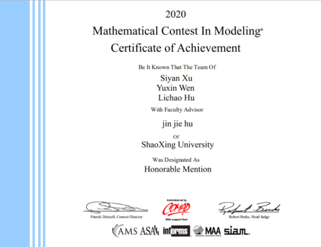 近期,2020年美国大学生数学建模竞赛(MCM/ICM)结果揭晓,绍兴文理学子获得Meritorious Winner奖2项,Honorable Mention奖 3项。这是继我校2019年在该赛事上取得的又一次优异成绩(2019年获得Meritorious Winner奖2项, Honorable Mention奖2项)。