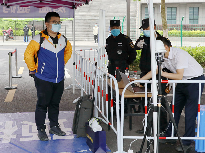 学校实行人流错时错峰抵校和校门口交通协调,自驾车辆即停即行,学生下车后立即进入专有通道。经过身份核实、两次体温检测、手部清洁消毒、更换口罩核验等程序,学生即可入校。进入校区后,工作人员和志愿者们帮助学生搬运行李,核验登记后进入宿舍。