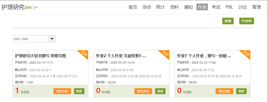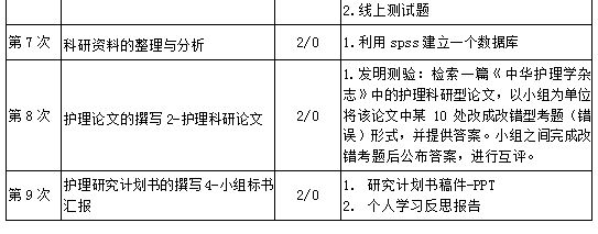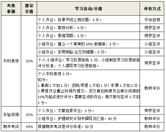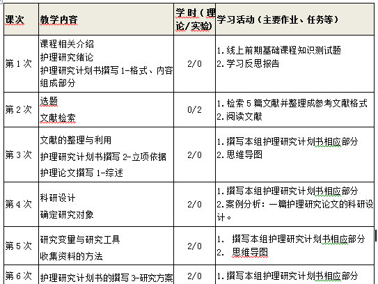 护理研究采用以学为中心的教学理念,以一致性建构为课程设计基本原则,从有意义学习分类法6个维度(核心知识、学以致用、触类旁通、人性维度、价值情怀和学会学习)制定学习目标,学习活动和学习测评。课程共9次课,采用线上线下混合式教学模式,以面授为基础(疫情期间采用直播方式),以学习通(超星泛雅)课程平台为线上依托,借鉴中国大学mooc平台中相关课程,以护理研究基本过程为理论学习主线,以一个小组任务(项目设计:撰写一份护理研究计划书)及其衍生的个人作业和小组作业为知识技能运用主线,以测验、讨论、知识分享、个人反思活动等为辅助,完成围绕护理研究计划书撰写(其内容组成部分实质是护理研究基本过程)的“边学边用”、螺旋式学习。