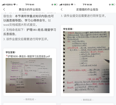 2.学生整体线上学习情况良好,签到率几乎100%,课堂测验准确率高,企业微信群或直播过程中能积极交流,能够及时完成课后作业和互评,展现了学生一定的自主学习态度和能力。另外,护理研究在课堂环节,以随堂反思或思维导图等主观任务为驱动,能够在一定程度上保证学习效果。
