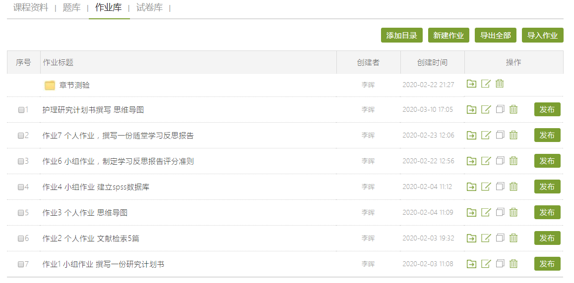 1.建设学习通课程平台。开课前做好课程整体设计、学习通课程平台整体框架搭建及前四次课程章节内容编辑上传。第一章为学习导航,包含课程介绍、学习内容计划安排、学习大纲、学习评价方法、相关学习网站推荐。后续章节分学习目标、学习内容、作业发布、拓展资源、章节测验及个别章节中会单设优秀作业展示。学习内容中包含:章节课件、相关视频、电子教材或教材相关内容文本、主题讨论等。