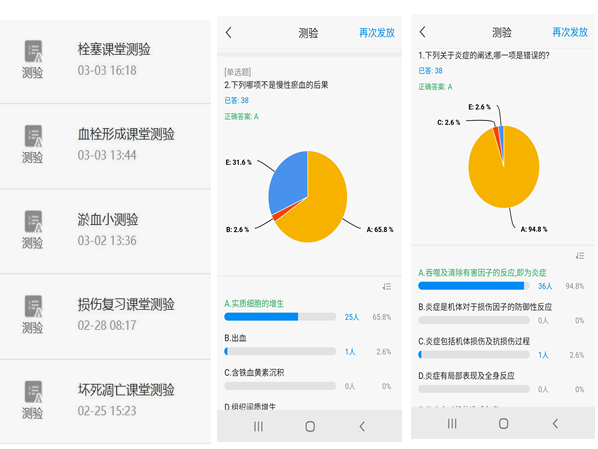 1.学习通教学平台建设。在正式开展线上学习前,课程组老师先在中国大学慕课、人卫慕课、学堂在线等优质慕课平台挑选病理学优秀教学资源,最终选定华中科技大学王国平教授主讲的病理学课程,并将契合我校的临床医学专业学生的前四周的教学视频进行录制并上传学习通,方便学生开展自主学习及在线学习情况统计。建设课程习题库,方便线上教学时开展课堂测验及章节测验,对学生学习效果进行检验。并在资料区上传教学课件、电子教材、校外拓展学习资源等。
