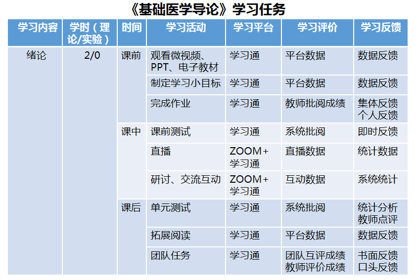 开课准备:《基础医学导论》于2017年2月在超星泛雅平台上线,已完成1个周期的线上线下混合式教学实践。本人结合多年积累的线上线下综合式教学经验,结合疫情,在原有的基础上,经过前期调研,优化了在线课程体系,细化了学习任务和知识结构,完善了教学资源,按知识点拆分录制微课和上传电子教材,并充实了试题库等。