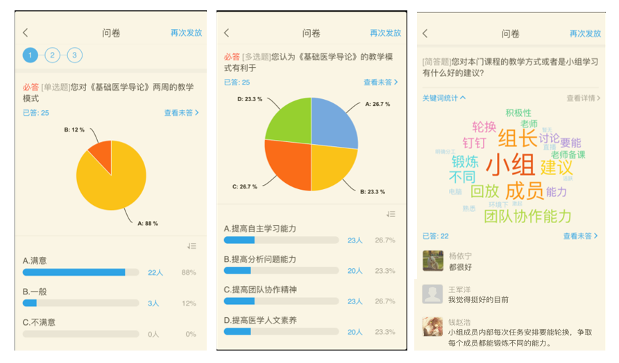 4.大数据是实施在线翻转课堂的精准条件 通过超星学习通在线学习大数据分析来实行线上教学实时反馈、督促与管理,通过邮件或短信督促学习计划滞后的学生,使其养成主动学习的良好行为,课程浏览量达104724人次,充分提高了学习效率。经过两周的线上教学数据表明,学生线上生生互动、师生互动参与度高;通过数据分析,88%的学生对在线翻转课堂教学模式满意, 92%的学生认为这种教学模式有助于提高自主学习能力和团队协作精神,80%的学生认为有助于提高自己分析问题的能力和医学人文素养。有的学生建议小组成员角色转换,使每个成员都能得到不同的锻炼能力。