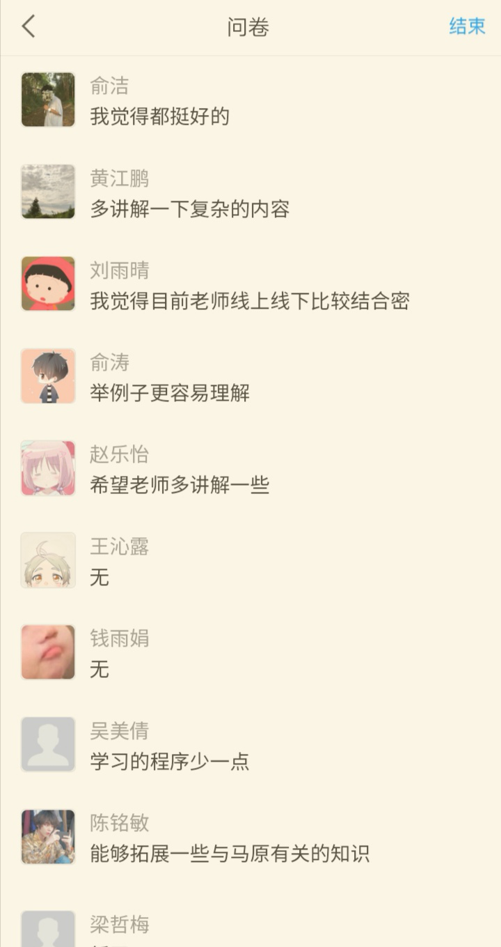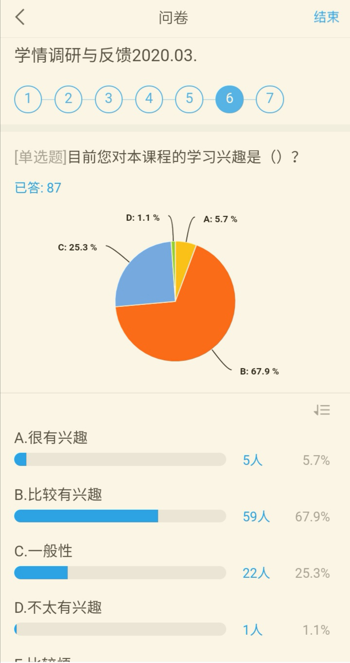 本课程通过学为中心、成果导向的课程设计,把课前预习、课后复习,与课程直播有机地结合起来的网络教学方式,能够为学生提供全方位的学习支持和学习激励。同时,借助学习通APP经常性地开展问卷调查,征询学生的教学意见,持续改进课程的教学设计。