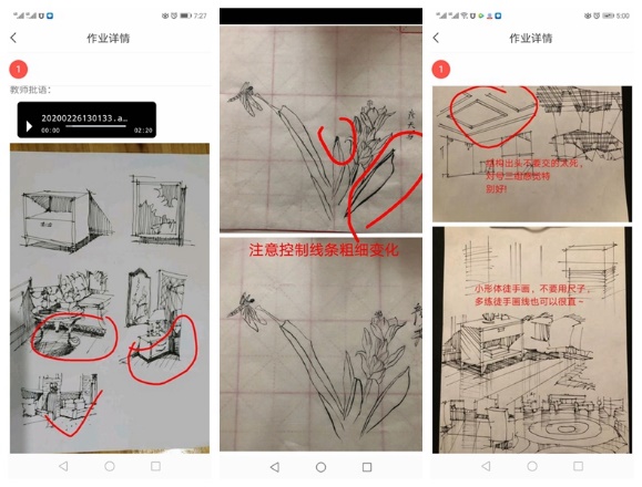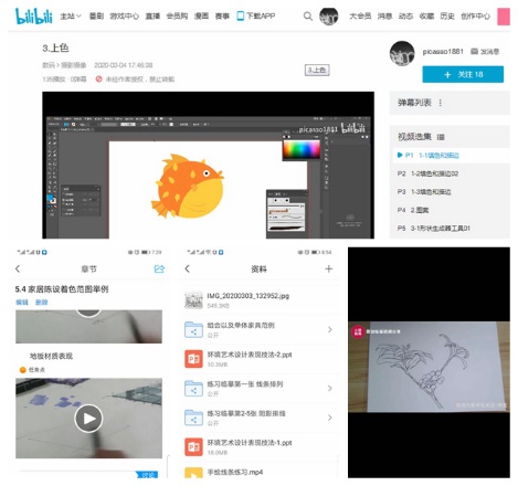 二阶段是“直播示范和探讨”的深度学习。通过教师的直播示范使同学更深入的了解课程内容的深刻含义,并跟随教师的示范进行深入的艺术与设计探讨,如刘磊老师的直播手绘效果图技法,使同学加强了对阶段一学习成果的运用并完成相应的课程作业。