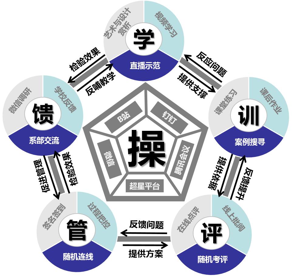 该生态中的“操”是指各种在线教学平台;“学、训、评、管、馈”指的是“课程教学”、“实习实训”、“考核评价”、“学生管理”、“教学反馈”五大课程教学的重要环节。老师们以艺术设计专业技术人才岗位职责和社会需求为导向,逐渐形成“教学体系” “实训体系” “考评体系” “学生在线管理体系” “在线反馈体系”,建成集“促学” “助训” “多评” “协管” “反馈”功能于一体的在线教学体系。五个维度相互影响、相互促进,形成以“操”为基础,以“学”为中心,以“训”为基本点,以“评”为促进,以“管”为支撑,以“馈”为反哺的五维一体“互联网+”教学新生态。