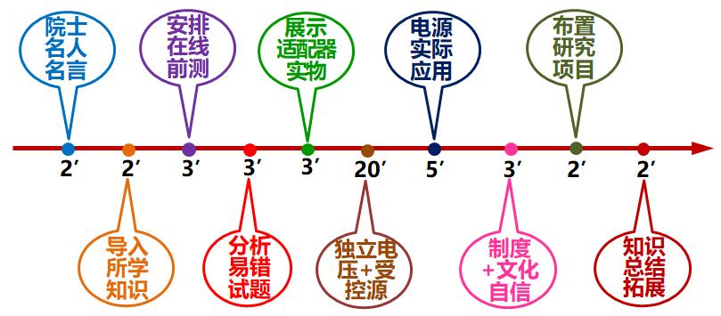 3.章节内容设计。以“独立电源和受控源”为例,45分钟的教学设计包括院士名人名言、知识点导入、安排在线测试、分析易错试题、手机充电器引入所学内容、讲解独立电源和受控源、分析电源实际应用,举例说明我国在电力方面取得的巨大成就从而验证制度自信和文化自信,安排快测式点名,知识总结拓展。各教学环节的时间节点安排见下图。