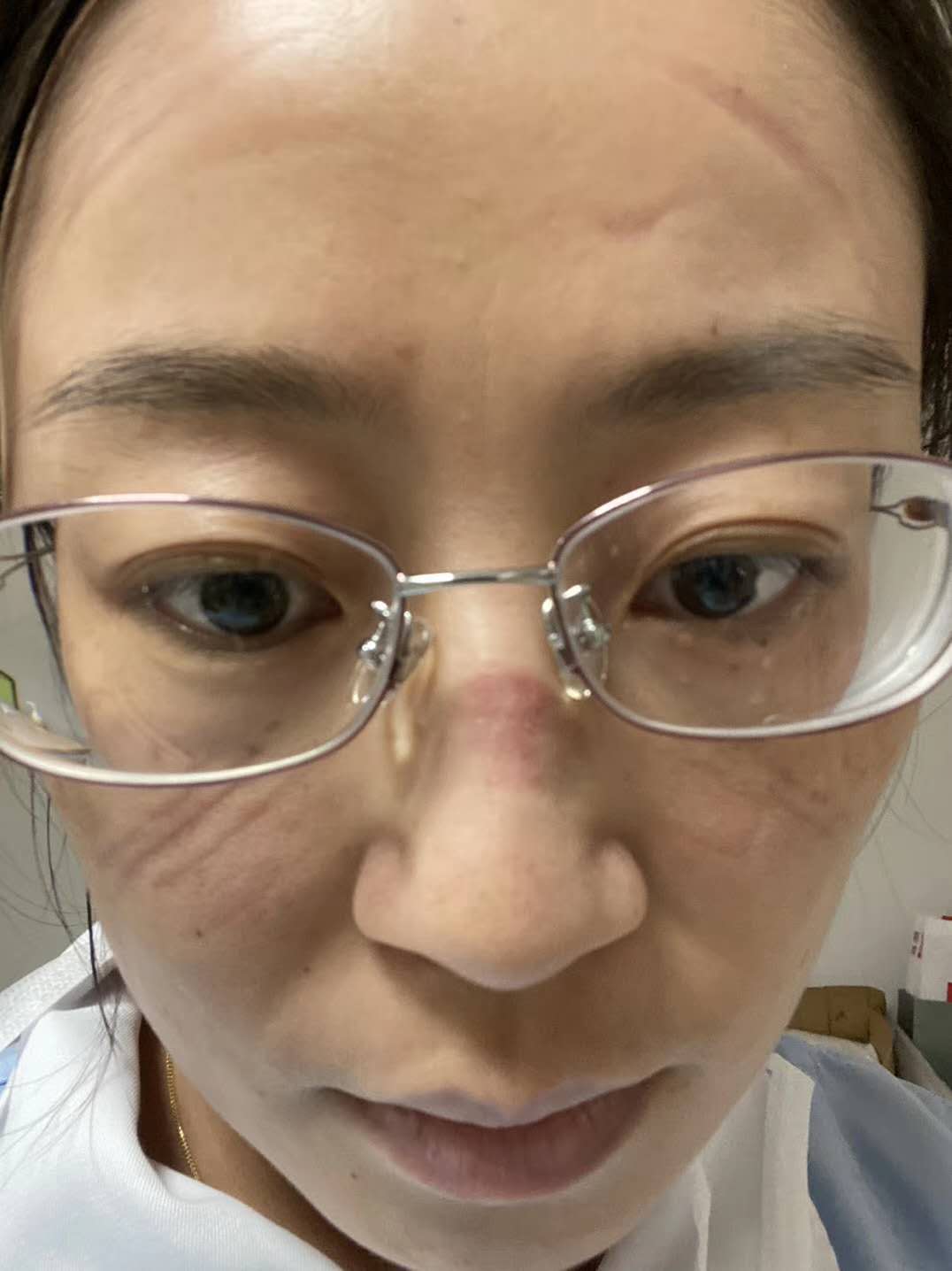 因为长时间佩戴口罩、护目镜,程桂兰的脸上被勒出深痕