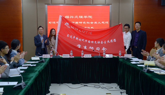在成立仪式上,唐和祥、陈均土向研习会和宣讲团授旗。马克思主义学院思政151班钱颀峰同学、生科院酿酒1511班李诗怡同学代表学生研习会和宣讲团接旗。