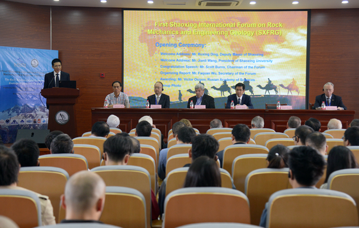 10月28日上午,首届岩石力学与工程地质绍兴国际论坛在岩石力学与地质灾害实验中心大楼隆重开幕。副市长丁如兴、校长王建力、副校长杜时贵、IAEG主席Scott Burns、ISRM副主席 Norikazu Shimizu、俄罗斯科学院院士, IAEG国家小组主席Victor Osipov、俄罗斯自然科学院院士伍法权教授和国内外知名岩石力学与地质灾害研究专家共50余人出席论坛开幕式。