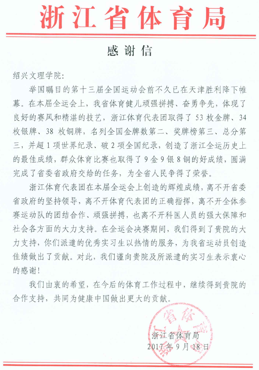 9月18日,浙江省体育局向我校发来感谢信,对我校派遣的运动康复151班金兴宇、龚子悦、吴彦森、饶思敏、汪磊、程鹏、徐鑫、凌健8名同学志愿者在第十三届全运会上作出的积极贡献表示衷心感谢。 浙江省体育局在感谢信中提到:“在全运会决赛期间,我们得到了贵院的大力支持,你们派遣的优秀实习生以热情的服务,为我省运动员创造佳绩做出了贡献。对此,我们谨向贵院及所派遣的实习生表示衷心的感谢!”信中还希望与我校在体育工作上继续加强合作,共同为健康中国作出更大的贡献。