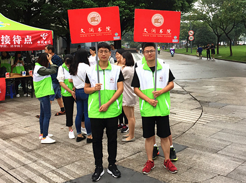 在迎新的各站点,迎新创意层出不穷。文澜书院的合影板、阳明书院的倡议书、建功书院的心愿墙等向新生表达美好祝愿,鼓励新生规划大学生活、认真对待每一天;仲申书院布置了可爱的创意语言板让“萌新们”感受到书院的温暖,还为每一位学生佩戴了书院徽章,这些具有书院标志特色的纪念品则成为了“书院人”的专属品;成章书院为新生和家长免费提供了姜茶和热水,为来自五湖四海的2017级新生们送上“新”家的温暖。