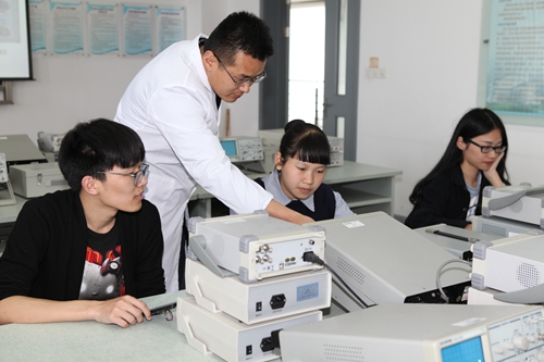 吴海飞老师指导学生调试仪器。2016年该实验小组发表论文2篇,申请专利1项。