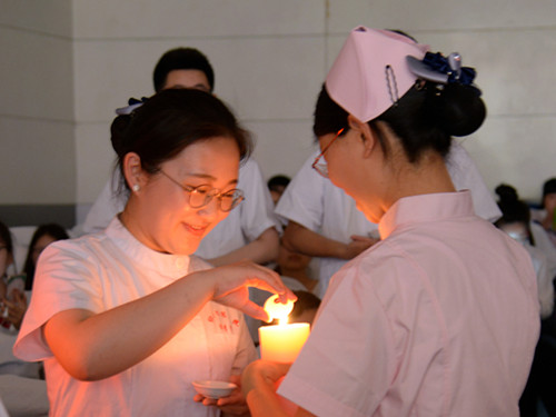 全体护生起立,李晖、徐凤娇两位护理专业老师点燃了象征着南丁格尔精神的红烛,并依次传灯,点亮了现场所有护生手中的蜡烛。温暖的烛光传递的不仅是仁爱、责任,也是护生们献身护理事业的坚定决心。此刻的铁城科教馆沐浴在肃穆庄严的气氛之中,格外神圣。