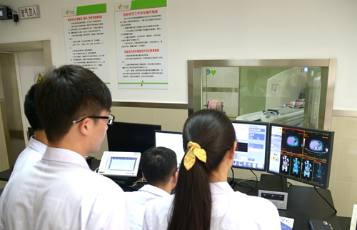 本专业拥有优越的实践教学条件。下图为学生在附属第一医院临床教师指导下操作PET/CT。