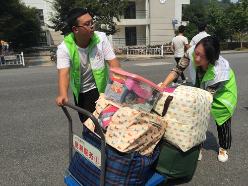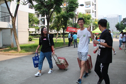 驻守在南山校区校门口的外国语学院党员先锋队,是文澜书院迎新的第一站。党员们佩戴党员徽章、身上系着红色绶带,积极地与新生家长们交流,耐心地解答新生的问题。他们的热情让新生们感觉到了校园的温暖和浓浓的情意。篮球场是人文学院党员先锋队的根据地,他们利用手推车和三轮车,热情地把新生的行李搬上车,“用尽洪荒之力”运往小拉入口。第三站,由法学院党员先锋队负责接待,他们热情迎接新生和载满行李的三轮车,帮他们把行李搬运到书院门口,真正实现了一场迎新的“全攻略”。
