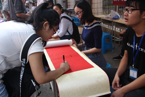 竞雄书院今年采用了卷轴签名的迎新设计,让前来报到的新生在卷轴上签上自己的名字,集合所有书院新生签名的卷轴将被书院收藏,留作纪念。这样富有创意的设计,给新生们眼前一亮的感觉。与此同时,竞雄书院按照对接的音体美专业,与相应的学院携手迎新,真正将“双院协同”的精神贯彻到迎新工作中。