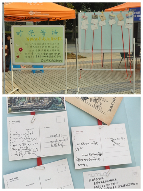为丰富迎新活动,建功书院巧思设计,在迎新现场开展了“时光寄语——写给四年光阴后的你”活动,引领新生从入校起就开始思考自己的大学四年应当如何过。“希望成为一名优秀的人民教师”、“希望减肥成功”、“希望四年光阴不虚度”……更有来自西藏的同学,用藏语写下他们对大学四年的展望和心愿,小小的明信片,开启了他们大学生涯规划的第一课,也承载了他们对大学生活的美好憧憬。