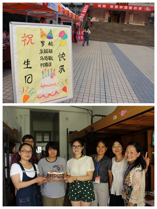 迎新当天,阳明书院有四位新生恰好过生日。书院得知后,在迎新现场布置起生日祝福栏,温馨的举措令新生们十分感动。随后,阳明书院院务主任与对应学院的领导一同为其中一位来自福建的新生送去了生日蛋糕和祝福,体现了书院迎新的人性化,更加凸显了“阳明书院一家亲”的服务理念。