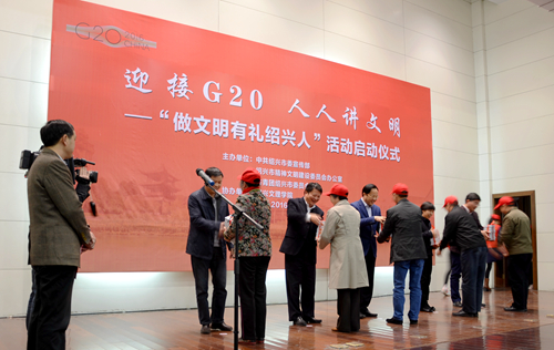 启动仪式上,大家一同观看了杭州主会场活动电视直播。随后,绍兴分会场活动正式开始。省道德模范董国光宣读《做文明有礼绍兴人倡议书》,号召大家从身边做起,做到言谈举止文明有礼、公共场合文明有礼、邻里相处文明有礼、行路驾车文明有礼、旅游观光文明有礼、网上交流文明有礼,为“建设生态绍兴、共享品质生活”努力。何加顺部长、丁晓燕副市长、沈赤副书记等领导分别为社会各界代表分发《做文明有礼绍兴人》口袋书,并为文明交通志愿服务劝导队、文明礼仪志愿服务宣讲队、文明单位志愿服务队、“五水共治”志愿服务队、“点亮一盏灯”、“孺子牛”志工服务队等有关志愿服务队授旗。何加顺部长宣布“迎接G20 人人讲文明——做文明有礼绍兴人”活动正式启动,在场的“文明使者”响应号召,上路劝导不文明行为。