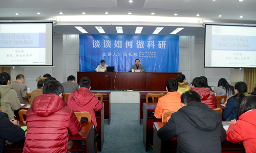 “最优秀的文献是在图书馆,而最前沿文献是在网络上,如何处理两者之间关系?”对此问题,冯教授认为文献可分为四种:原创性的,时效性强;综述性的,与现在的科研距离较远;学术专著,权威性高,经过时间的沉淀,得到科学共同体的共同认可;在校生写的学位论文。每种文献都各有所长,也有各自的局限性,要学会综合利用四种文献,提高研究中的自由度。对于“如何进行理性思考和培养抽象思维”这一问题,冯教授认为进行理性思考的最好途径是写总结报告,多读学术报告;而培养抽象思维则在于多发表学术论文,把自己的研究成果以文字的形式表述发达出来。在互动交流环节中,对于研究生提出的问题,冯长根教授都作了详细解答。