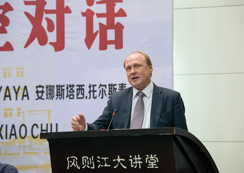 “托尔斯泰是俄国文学同样也是世界文学的化身,虽然见不到本人,但是我们同样可以从他们后代身上感受到其本人的精神风貌。”上海外国语大学教授、文学研究院院长郑体武教授对此次活动给予高度评价。他指出,鲁迅不仅欣赏托尔斯泰的文学,并在翻译和学习俄国文学时仍不忘维护、发扬、挖掘中国文化。与此同时,郑教授呼吁在座学生,在鲁迅精神的感召下,积极投身文学研究和创作中,尤其是对俄国文学和鲁迅的研究,继承并发扬优秀的文学艺术。