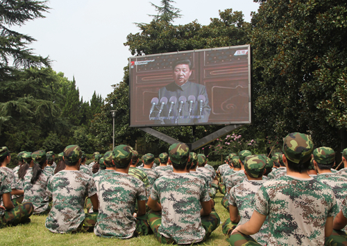 我校组织2014级军训学生集体观看抗战胜利70周年纪念大会直播。借助于文化校园建设新近安装的校园LED电子显示屏等设备,上午9:30操练结束,军训学生以学院为单位,集合到河东鲁迅铜像旁、河西餐厅、南山大门口、南山餐厅、南山综合楼、财贞楼报告厅、元培报告厅、兰亭校区餐厅等处,集中观看抗战胜利70周年纪念大会直播。校党委副书记唐和祥,校党委委员、宣传部部长胡保卫,学工部、保卫处、校团委负责人,各学院学生工作副书记,各连队教官、指导员共同收看这一盛况。