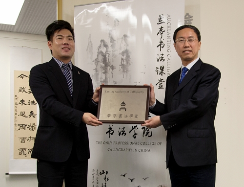 5月14日,代表团在奥克兰大学参加了“兰亭书法学堂”揭牌仪式。叶校长代表学校在仪式上发表演讲。他表示,兰亭书法学院是我校的一张金名片,书法是中华文化的载体,学校可以书法作为平台,通过“兰亭书法学堂”的运作模式到海外设立书法课堂,让我校的师生走出国门,到海外开展书法教学和实践活动,把中国的书法艺术推广到海外,同时以此来促进学校教育国际化的进程。参加揭牌仪式的有奥克兰大学孔子学院外方院长姚载瑜女士、奥克兰大学艺术学院副院长Jim Speers先生、我国驻奥克兰总领事馆教育领事房东波先生以及新西兰社会各界人士。在仪式上,我校人文学院对外汉语的学生向与会者介绍了“兰亭书法学堂”。根据奥克兰大学的安排, 2015年7月12日将会举行“兰亭书法学堂”的开班仪式,奥克兰大学艺术学院的学生将有机会把书法作为一门选修课进行学习。